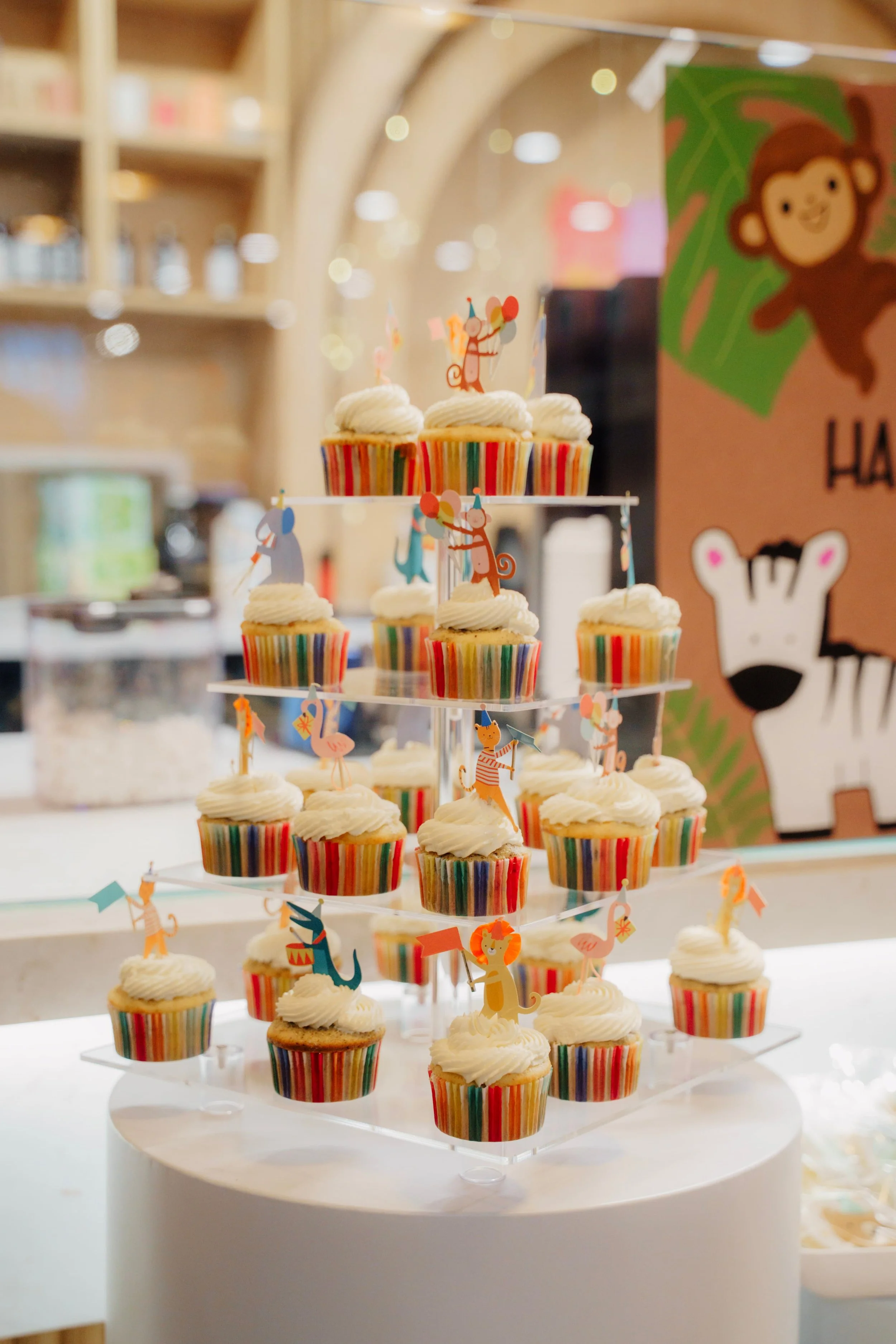 Custom design cake or 3 dozen cupcakes that go with theme. (all placed on cylinder display stands in front of backdrop and balloon garland)