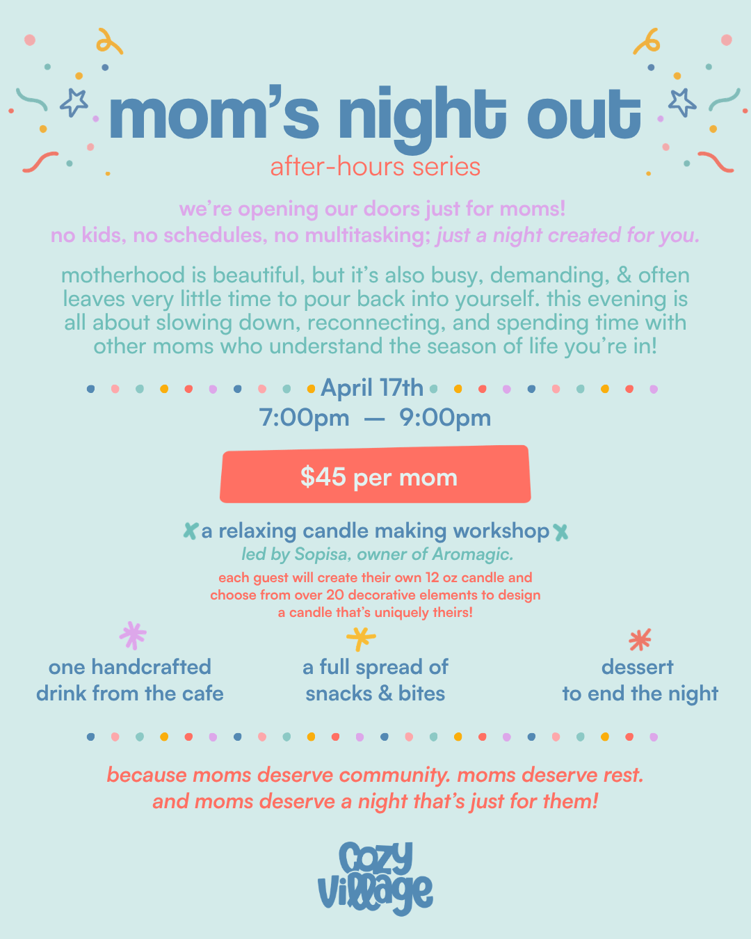 Join us for a special After Hours Series at Cozy Village Play Cafe — Mom’s Night Out 🤍✨